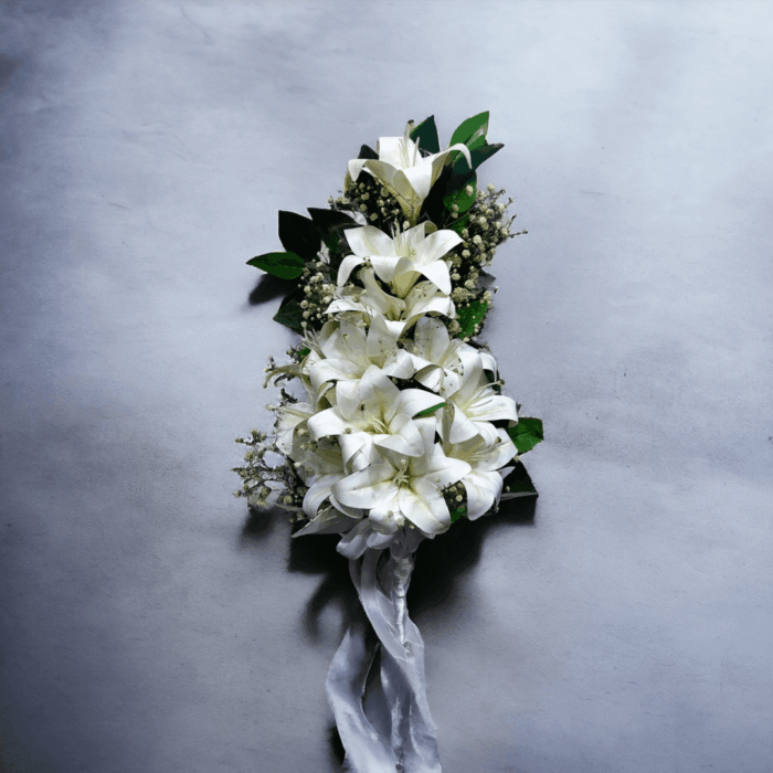 A classic artificial bouquet of white lilies with touches of baby’s breath, perfect for weddings and refined occasions.