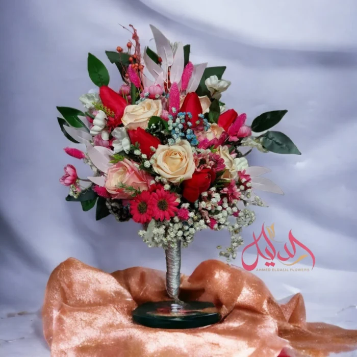 A structured bridal bouquet made of preserved white baby’s breath, accented with crystal stems and gold wire details.